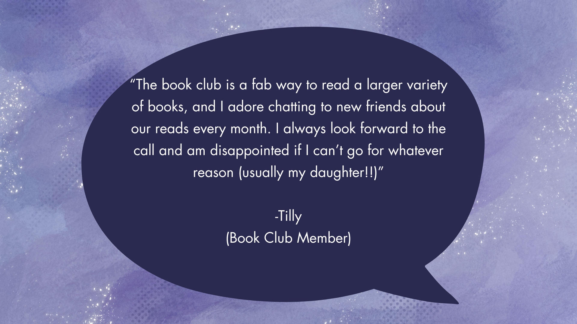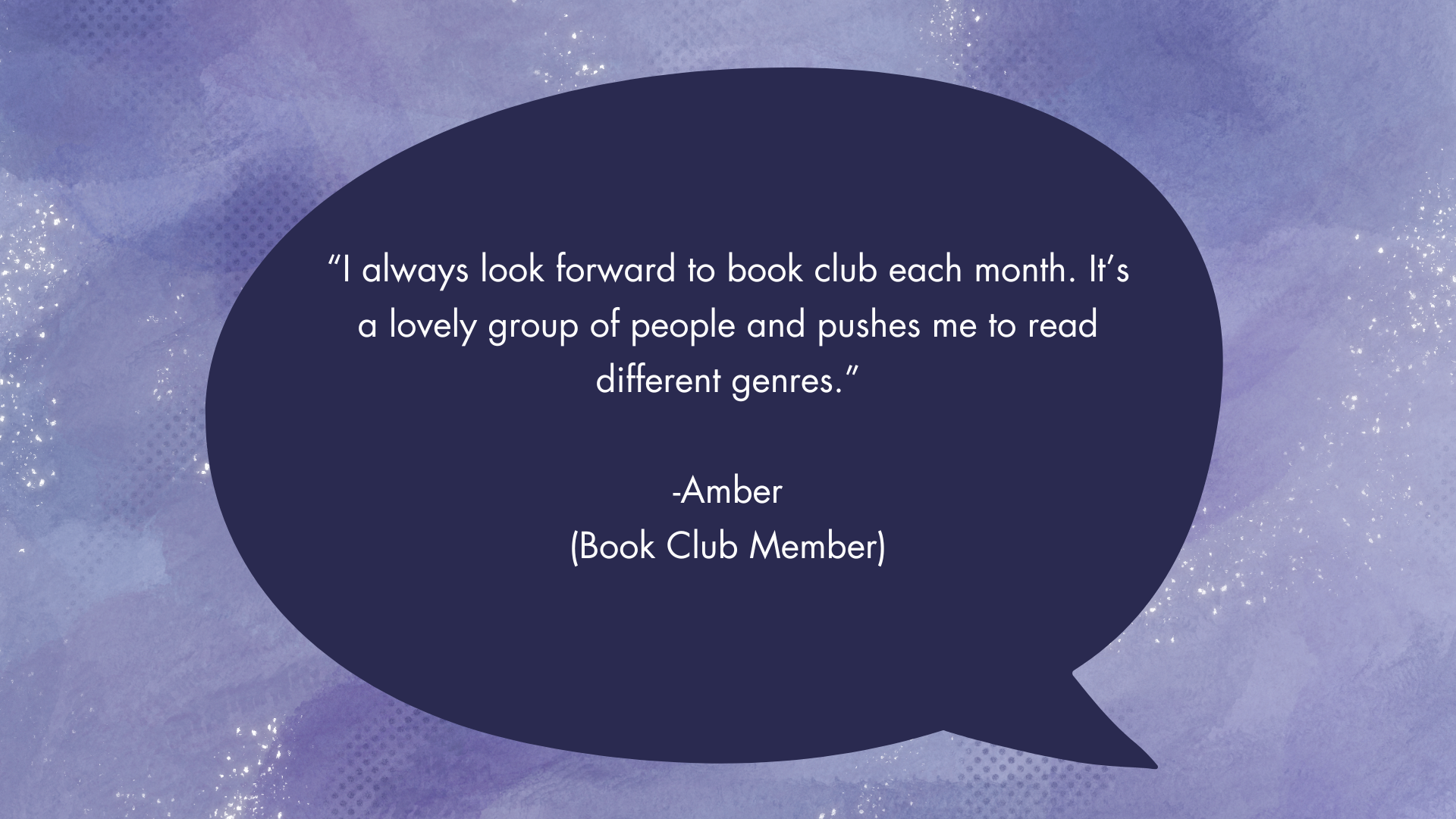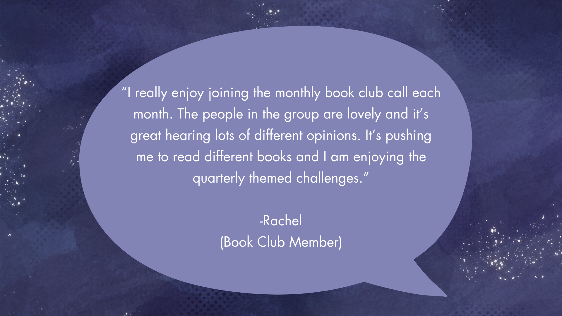 Each month our members suggest books and one is picked at random for us to read. We have a mid-month check in and then a call at the end of the month to chat about the book and it's themes.